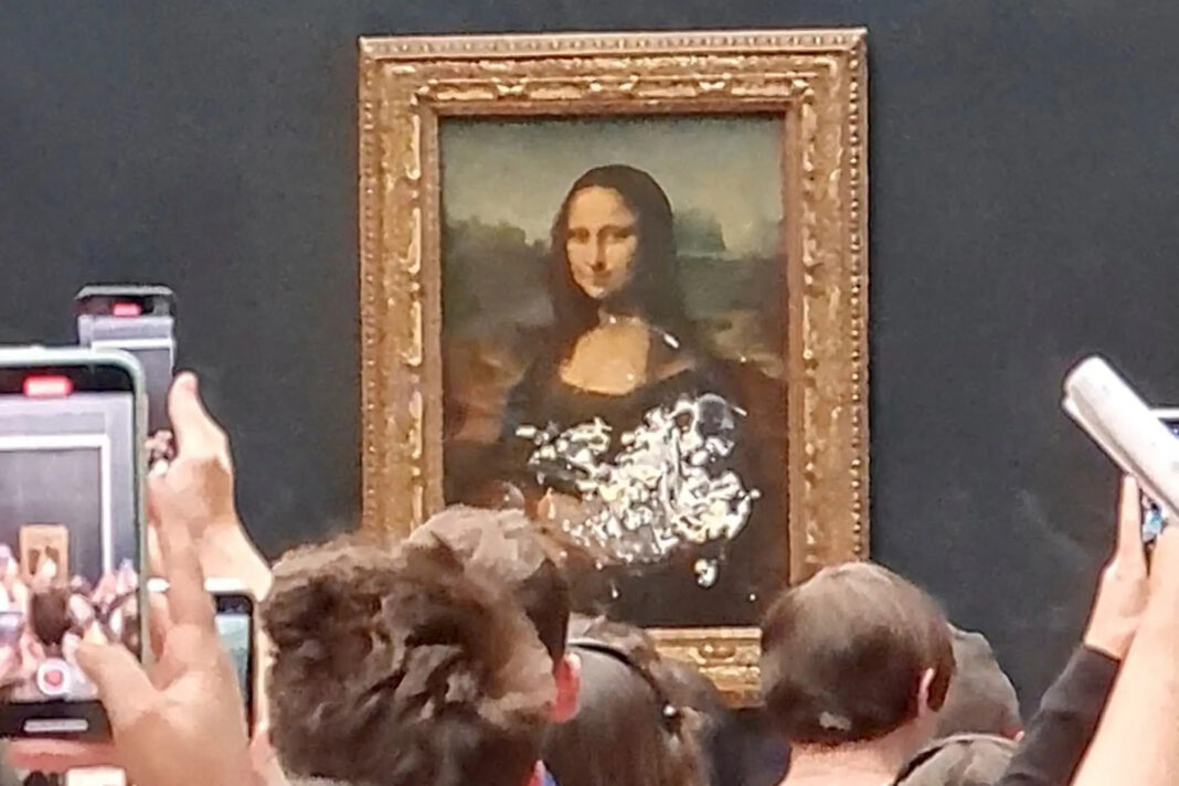 The Mona Lisa was attacked by a cake-throwing eco-warrior in a bizarre stunt that thankfully failed to damage her famous smile.